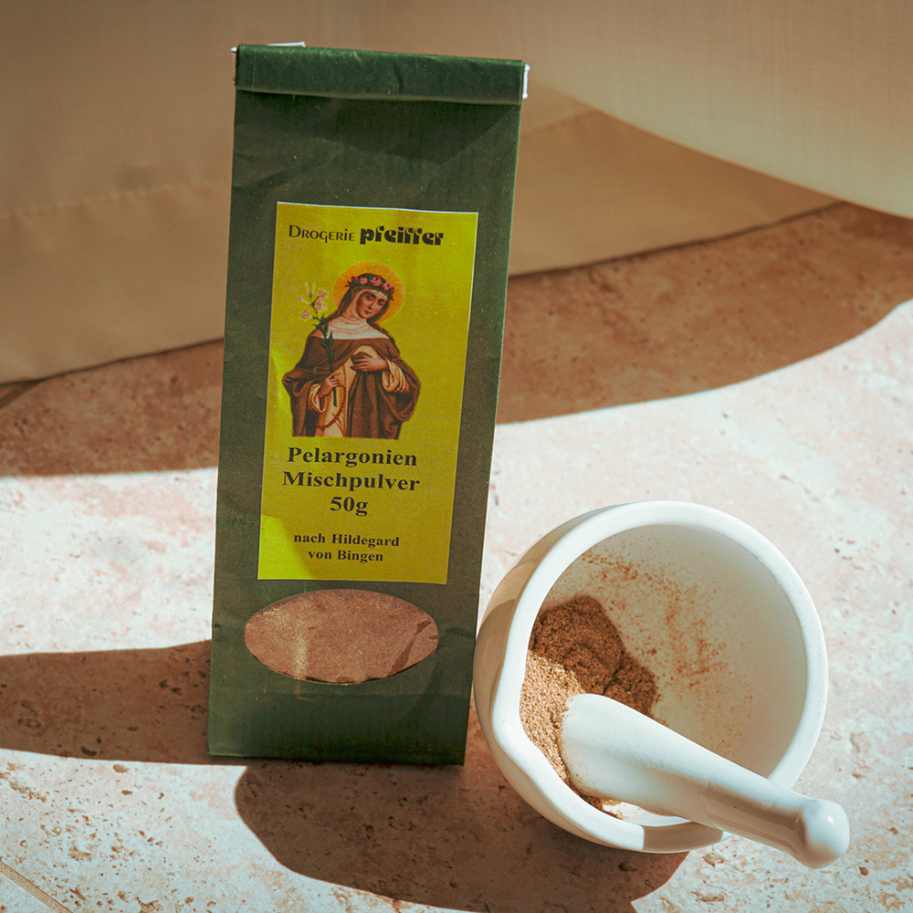 Unser Pelargonienmischpulver nach Hildegard von Bingen stärkt die körpereigenen Abwehrkräfte und schenkt neue Energie und Kraft. Auch für Erkältungskopfschmerzen und Föhnkopfschmerzen wird das Mischpulver gerne eingesetzt.