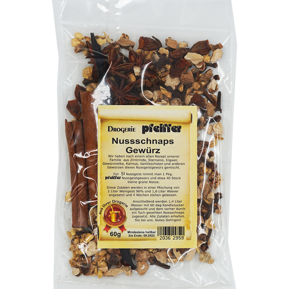 Zubereitung: 1 Packung Drogerie Pfeiffer Nussschnaps-Gewürz und etwa 40 Stück kleine grüne Nüsse werden in einer Mischung von 2 Liter Weingeist (96 Vol.%) und 1,6 Liter Wasser angesetzt und 4 Wochen stehen gelassen. Anschließend werden 1,4 Liter Wasser mit 60 dag Kandiszucker aufgekocht und dem vorher durch ein Tuch geseihten Nussschnaps zugesetzt.