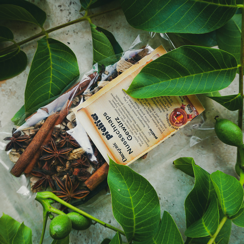 Wir haben nach einem alten Rezept unserer Familie aus ausgewählten und äußerst hochwertigen Gewürzen das Nussgeistgewürz gemischt. Um den intensivsten Geschmack zu erzielen, werden zusätzlich zu unserem Nussschnapsgewürz 1 Liter Weingeist (96 Vol.%), 1,5 Liter Wasser, 30 dag Kandiszucker und natürlich kleine grüne Nüsse benötigt. Etwa 20 Stück.