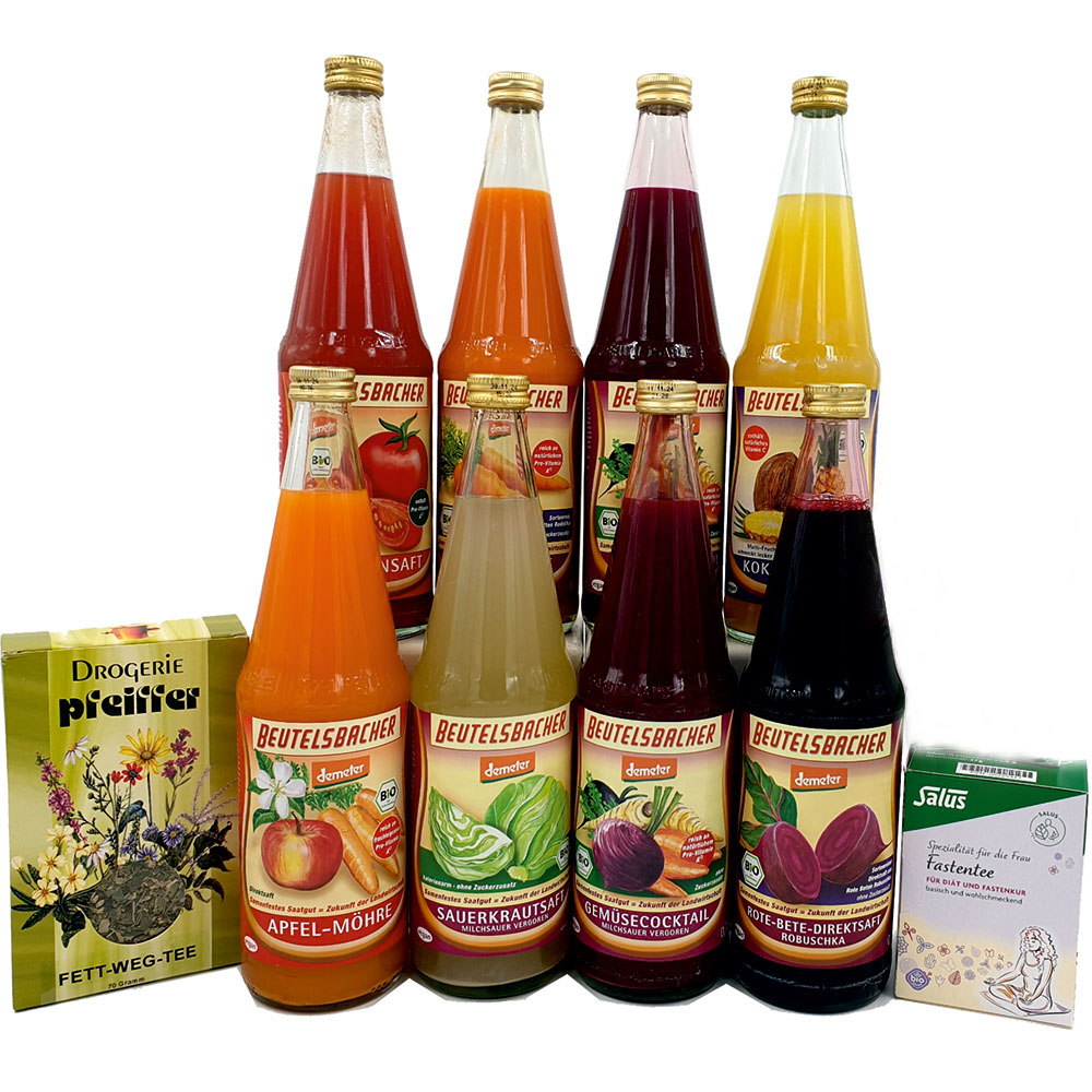 Inhalt: Bio Tomatensaft 0,7L, Bio Karottensaft 0,7L, 2x Bio Gemüsesaft-Cocktail 0,7L, Bio Kokos-Ananassaft 0,7L, Bio Apfel-Karottensaft 0,7L, Bio Sauerkrautsaft 0,7L, Bio Rote-Bete-Saft 0,7L, Bio Zitronensaft 0,2L, Drogerie Pfeiffer Fett-Weg-Tee 50g, Salus Bio Fastentee + GRATIS Anleitung zum Saftfasten & GRATIS Beutelsbacher Bio Zitronensaft 0,2L